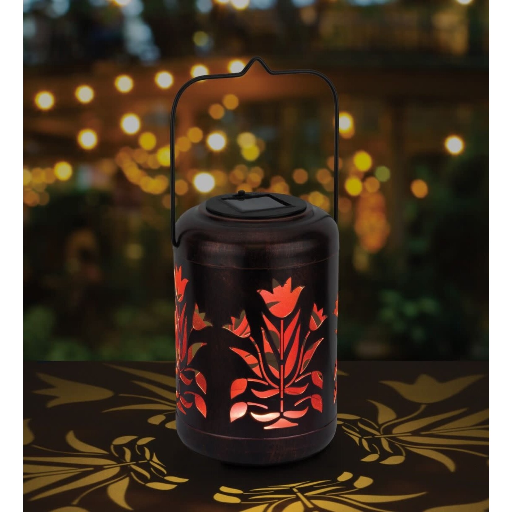 Laser cut floral patterns in the metal create a distinctive glow and shadow on a table or the ground at night. A solar powered LED light inside the lantern reflects off the inside colorful metallic paint.